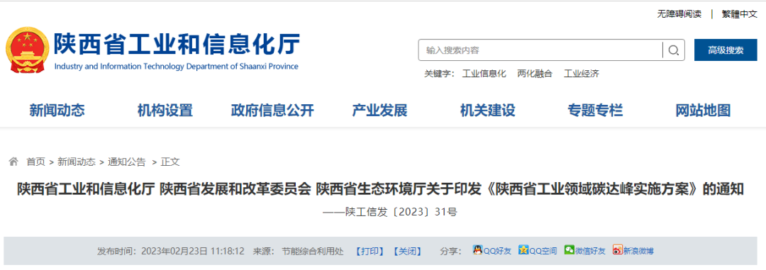 近日,陜西省工業(yè)和信息化廳發(fā)布“陜西省工業(yè)和信息化廳、陜西省發(fā)展和改革委員會(huì)、陜西省生態(tài)環(huán)境廳關(guān)于印發(fā)《陜西省工業(yè)領(lǐng)域碳達(dá)峰實(shí)施方案》的通知”。