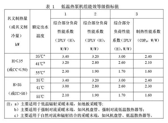 這項標準要求低溫熱泵機組能效等級依據(jù)性能系數(shù)的大小確定,依次分成1、2、3三個等級,1級表示能效最高。根據(jù)產(chǎn)品的名義制熱量、額定出水溫度,確定產(chǎn)品的類別;依據(jù)表1判定該類別產(chǎn)品的額定能效等級。對于產(chǎn)品涵蓋不同額定出水溫度工況時,應測試每個額定出水溫度工況下的能效指標,應均不小于表1中能效等級所對應的指標規(guī)定值。