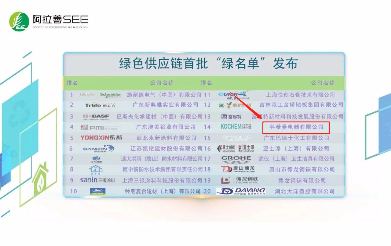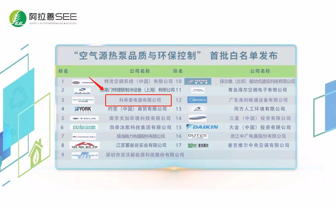 SEE第八屆中國企業(yè)綠色契約論壇上,房地產(chǎn)綠鏈行動項目發(fā)布了多項項目成果,科希曼電器有限公司入選綠色供應(yīng)鏈?zhǔn)着G名單企業(yè)、“空氣源熱泵品質(zhì)與環(huán)保控制”首批白名單企業(yè)。