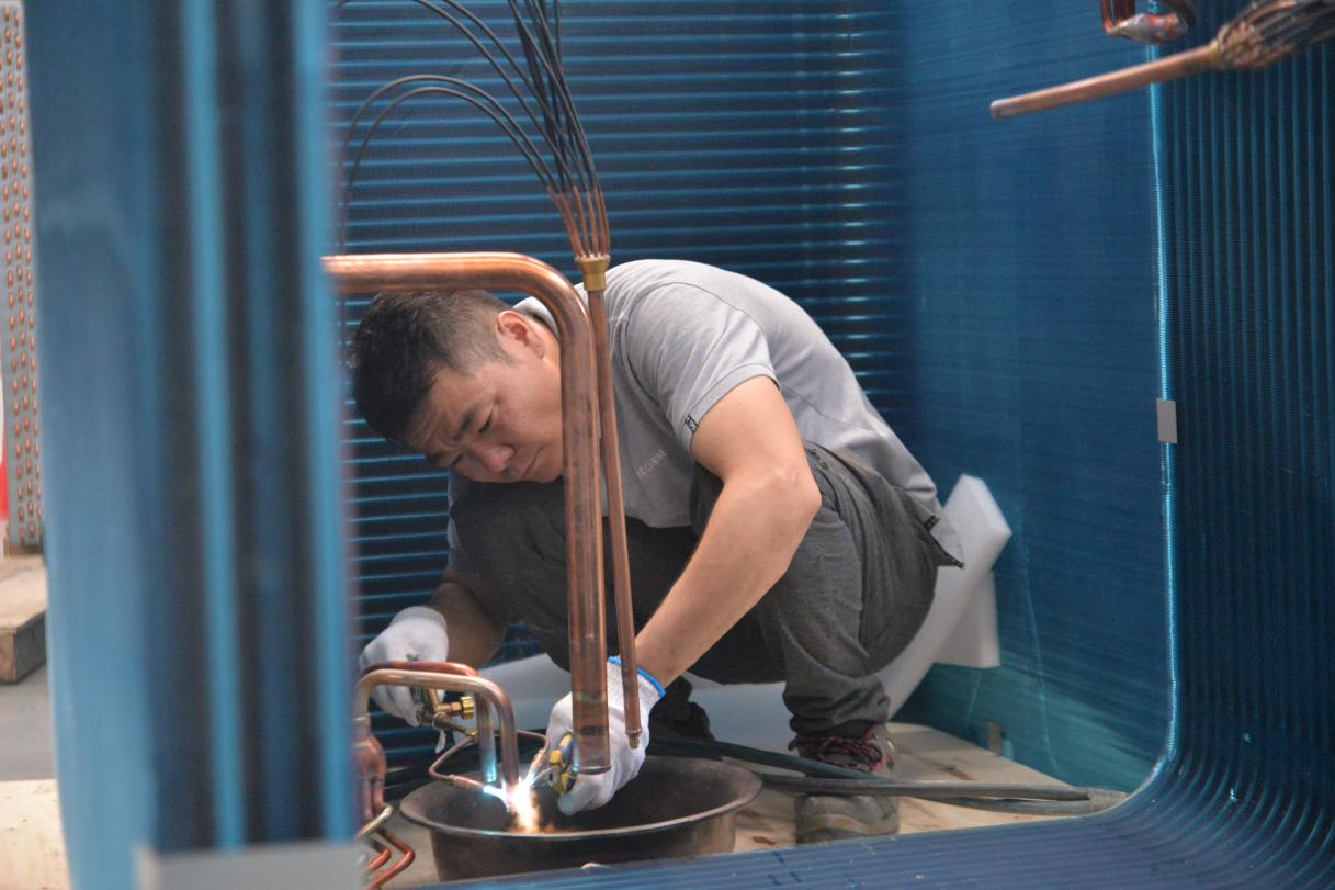 除了通過各部門團結(jié)協(xié)作及各員工加班加點提升進度,科希曼還升級生產(chǎn)設(shè)備,改變傳統(tǒng)的人工和叉車安裝蒸發(fā)器方式,使用行吊,配置專業(yè)夾具,實現(xiàn)蒸發(fā)器自動化安裝,有效提高生產(chǎn)效率。