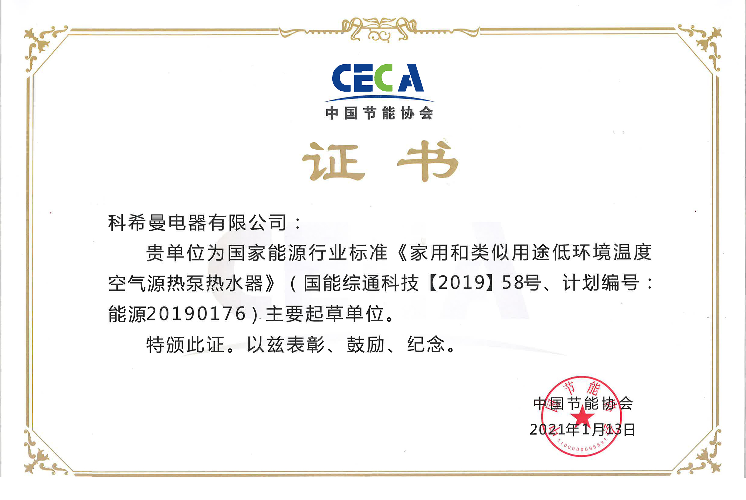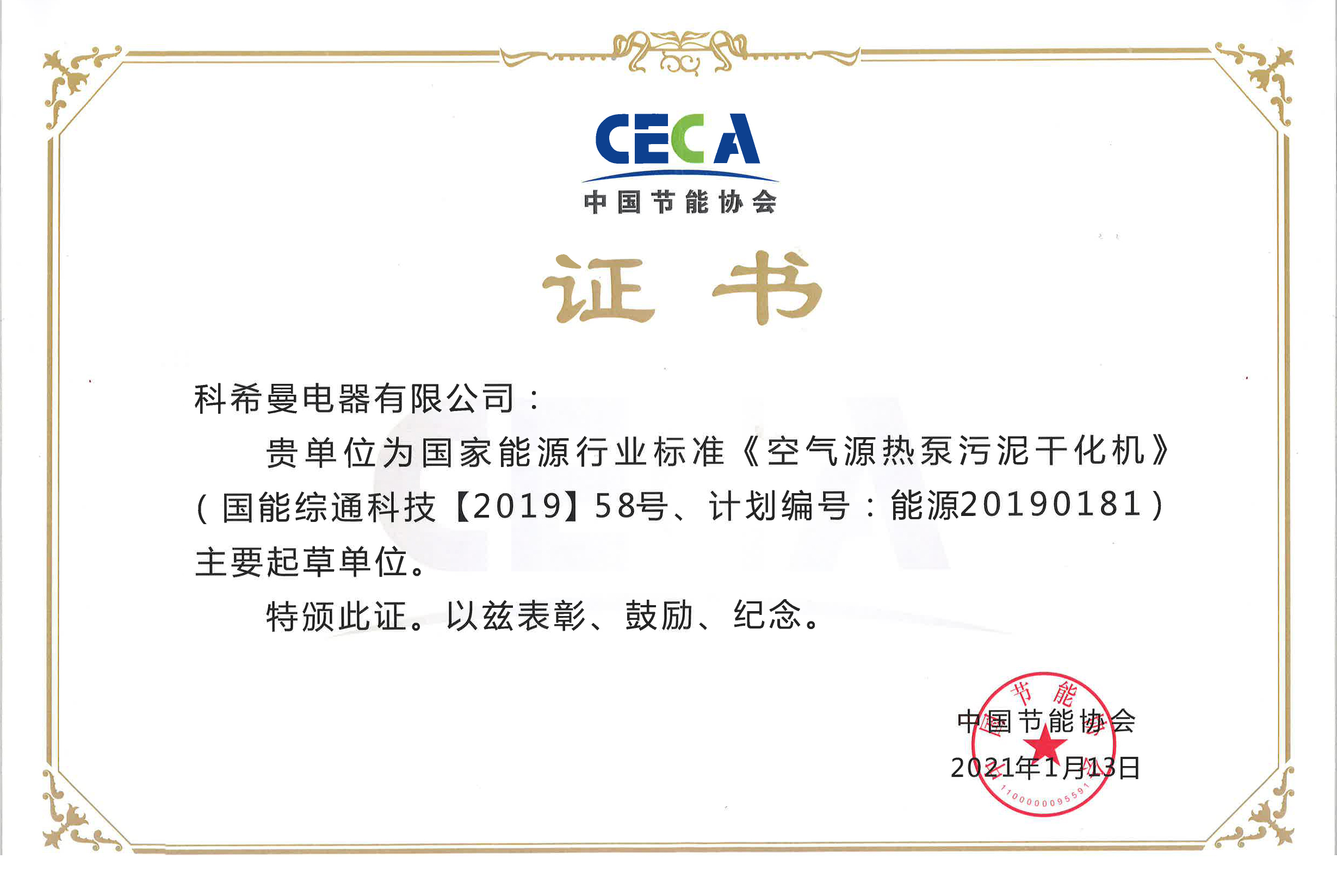 由科希曼電器有限公司主筆起草的國(guó)家能源行業(yè)標(biāo)準(zhǔn)《家用和類似用途低環(huán)境溫度空氣源熱泵熱水器》《空氣源熱泵污泥干化機(jī)》經(jīng)中國(guó)節(jié)能協(xié)會(huì)批準(zhǔn)認(rèn)證并正式頒發(fā)證書。