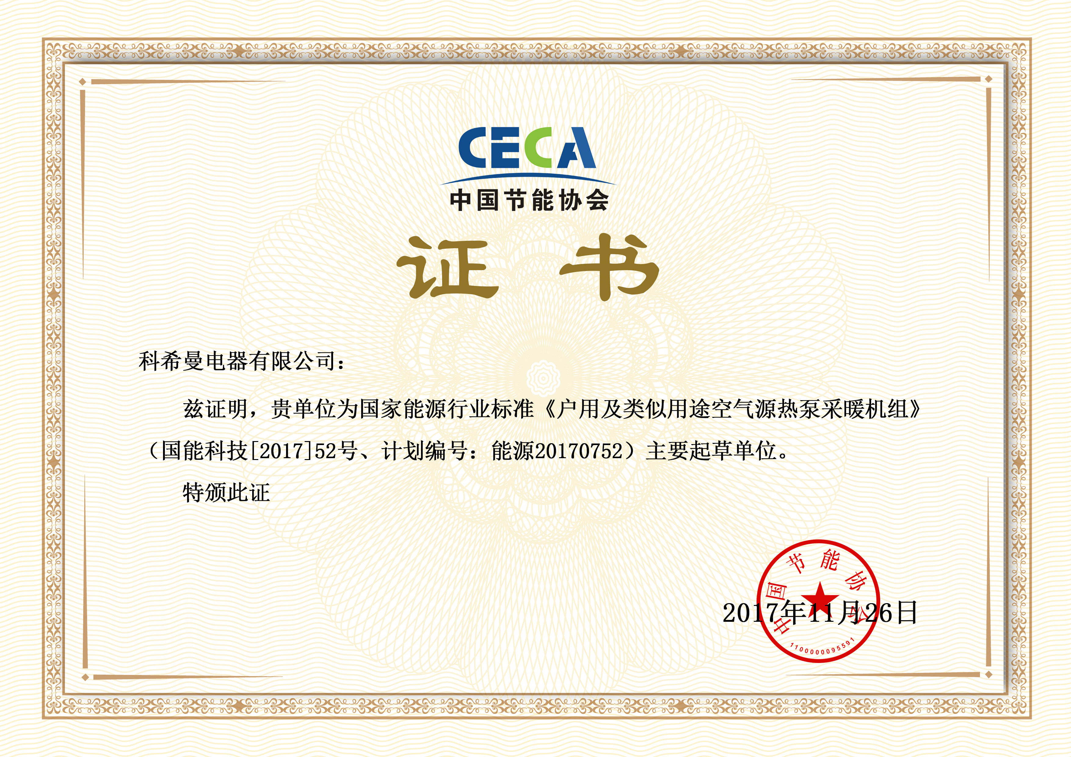 早在2017年,科希曼就已經(jīng)獲得一項(xiàng)國(guó)家標(biāo)準(zhǔn)主要起草單位認(rèn)證——國(guó)家能源標(biāo)準(zhǔn)《戶用及類似用途空氣源熱泵采暖機(jī)組》主要起草單位。