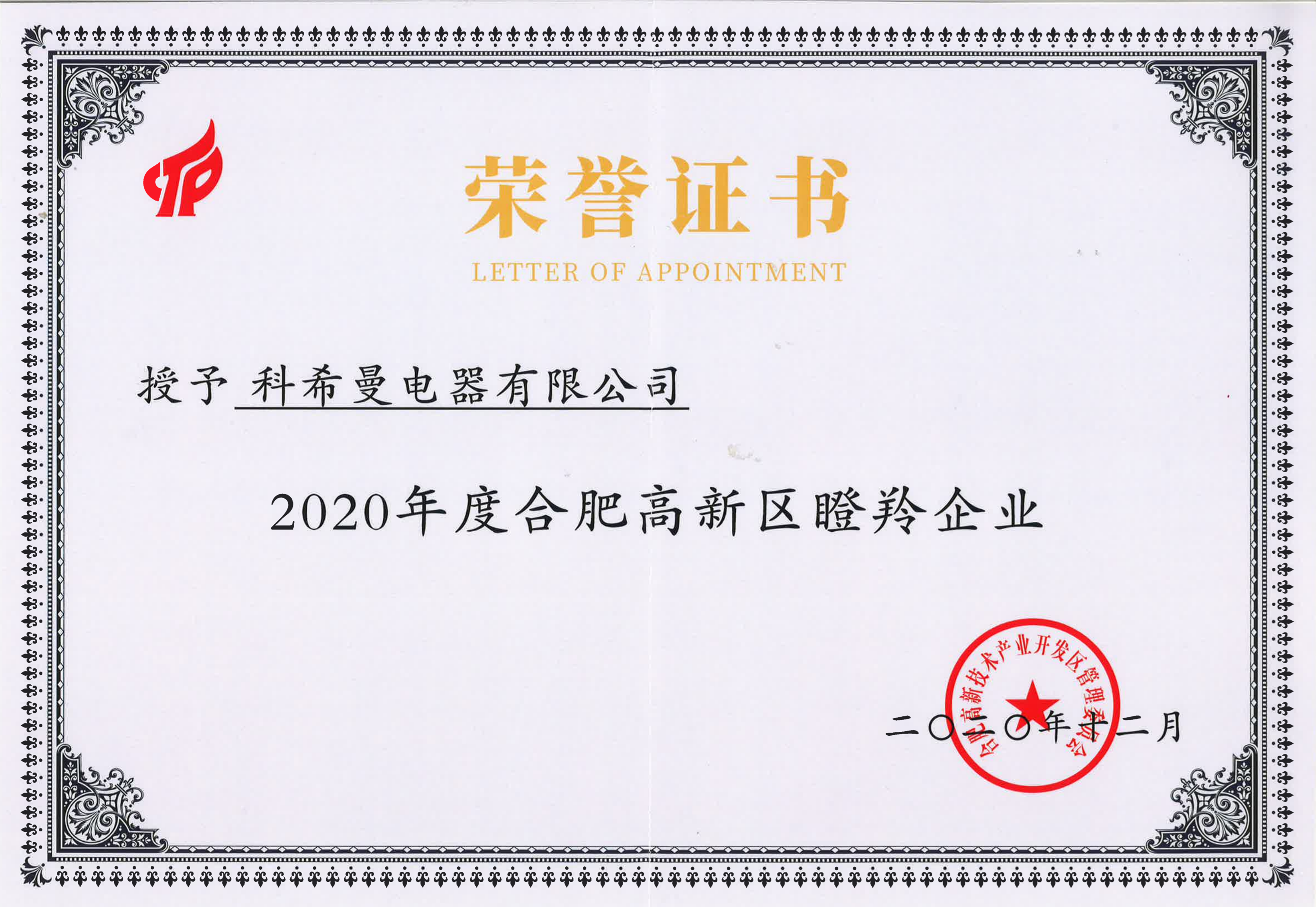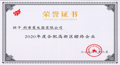 在剛剛過去的2020年,科希曼電器有限公司榮獲2020年度合肥高新區(qū)瞪羚企業(yè)。