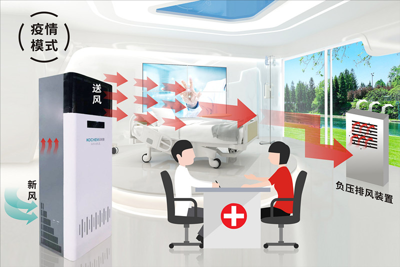 科希曼醫(yī)用負壓殺毒空調(diào)針對社區(qū)醫(yī)院及小型發(fā)熱門診易在疫情期間成為二次傳染源的問題,在具備傳統(tǒng)空調(diào)功能的同時,集成負壓模塊。在室內(nèi)風(fēng)機盤管中設(shè)置初效、中效、高效過濾層、臭氧、紫外線除臭滅菌及負離子的裝置,一方面去除室外新風(fēng)中的細顆粒物(PM2.5)和病原體,通過送回風(fēng)口設(shè)置形成空氣高效流動消除細顆粒物并抑制病原體傳播;另一方面,利用負壓新風(fēng)系統(tǒng)讓室外新鮮空氣經(jīng)通風(fēng)口過濾、殺菌、凈化后,自動進入室內(nèi),形成排風(fēng)、進風(fēng)的不間斷持續(xù)地循環(huán)。符合《傳染病醫(yī)院建筑設(shè)計規(guī)范》要求,解決了社區(qū)醫(yī)院及門診由于人員聚集和人員流動帶來的交叉感染問題。機器設(shè)置多種運行模式,正常模式下能作為空調(diào)產(chǎn)品日常使用;在疫情模式下開啟負壓模塊,在保障過濾殺菌的同時加大新風(fēng)輸入并輔助無人狀態(tài)下的臭氧殺毒實現(xiàn)對醫(yī)療空間的全方位防護。