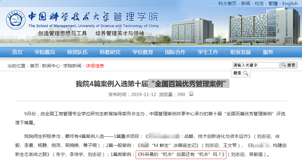 由全國工商管理專業(yè)學(xué)位研究生教育指導(dǎo)委員會主辦,中國管理案例共享中心承辦的第十屆“全國百篇優(yōu)秀管理案例”評選落下帷幕??拼蠊芾韺W(xué)院編寫的科希曼發(fā)展模式案例入選“全國百篇優(yōu)秀管理案例”,未來將作為商學(xué)院的案例教材使用。