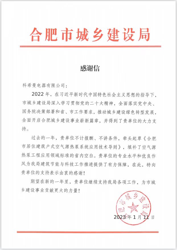 信中提到,在2022年度,科希曼主動(dòng)擔(dān)當(dāng),不計(jì)報(bào)酬,牽頭起草了《合肥市居住建筑戶式空氣源熱泵系統(tǒng)應(yīng)用技術(shù)導(dǎo)則》,填補(bǔ)了空氣源熱泵工程應(yīng)用領(lǐng)域標(biāo)準(zhǔn)的省內(nèi)空白??葡B膶I(yè)水平和優(yōu)良作風(fēng)為建筑節(jié)能與科技工作推進(jìn)提供了有力保障,對(duì)科希曼的支持表示由衷的感謝。