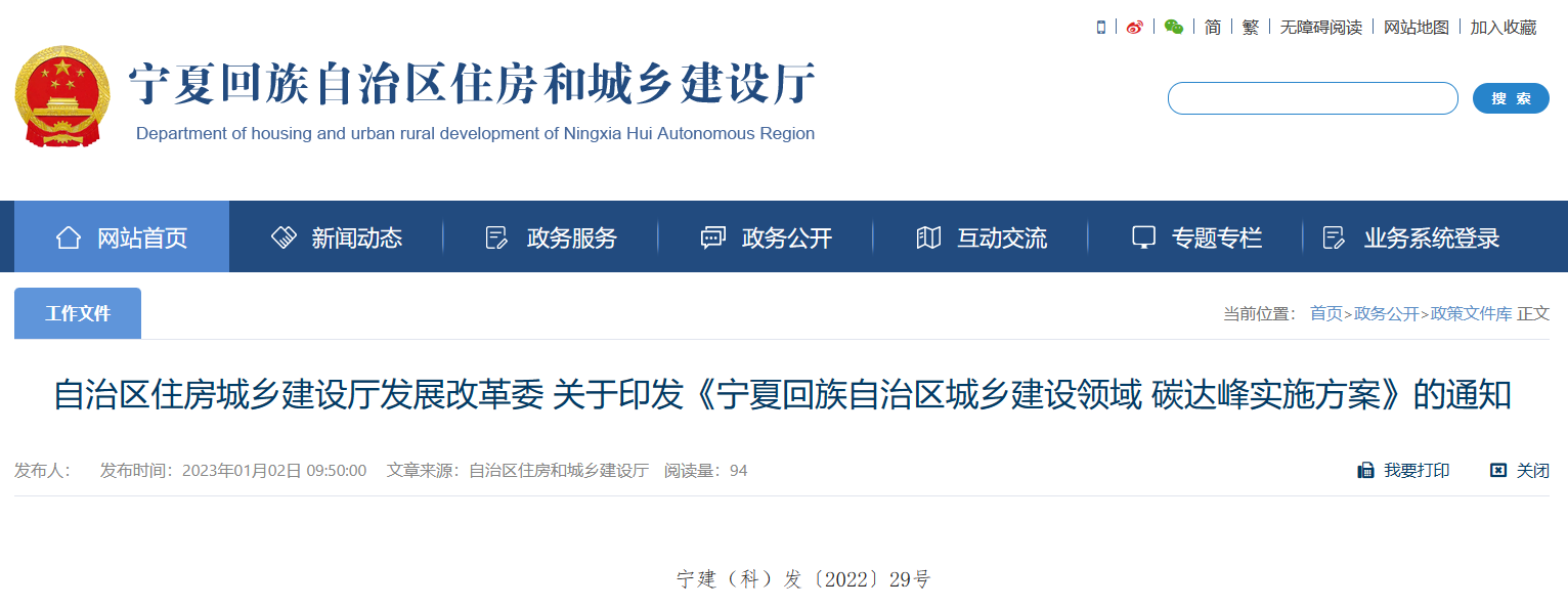 近日,寧夏回族自治區(qū)住房和城鄉(xiāng)建設廳發(fā)布自治區(qū)住房城鄉(xiāng)建設廳發(fā)展改革委關于印發(fā)《寧夏回族自治區(qū)城鄉(xiāng)建設領域 碳達峰實施方案》的通知。