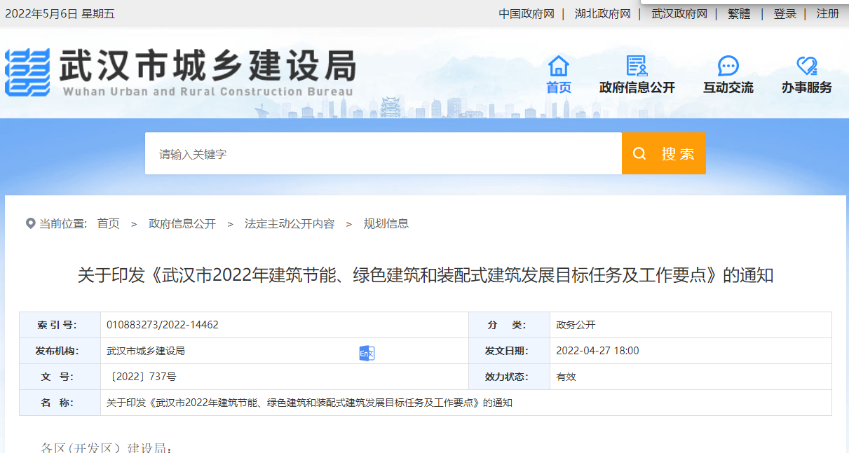 近日,武漢市城鄉(xiāng)建設局發(fā)布關于印發(fā)《武漢市2022年建筑節(jié)能、綠色建筑和裝配式建筑發(fā)展目標任務及工作要點》的通知,《通知》工作目標中指出:促進可再生能源建筑規(guī)模應用。各區(qū)(開發(fā)區(qū))竣工建筑面積中可再生能源建筑應用面積占比不低于30%。全市竣工可再生能源建筑面積不低于985.5萬平方米。《通知》工作要點中提出:大力推動可再生能源建筑規(guī)模應用,新建建筑應安裝太陽能系統(tǒng)、地源熱泵系統(tǒng)或空氣源熱泵系統(tǒng)等可再生能源系統(tǒng),可再生能源建筑系統(tǒng)應與建筑同期設計、同步施工、同時投入使用。全市新建建筑可再生能源替代率不低于10%、太陽能光伏建筑應用不低于23.31兆瓦。